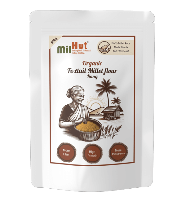MilHut Foxtail Millet Flour (Navane/Kangni/Korra/Thinai) is a wholesome, stone-milled atta made from traditional foxtail millet – an ancient grain valued in India for its rich nutrition and easy digestibility. High in protein, dietary fiber, and essential minerals like iron and magnesium, foxtail flour is a gluten-free, diabetic-friendly superfood for everyday cooking.